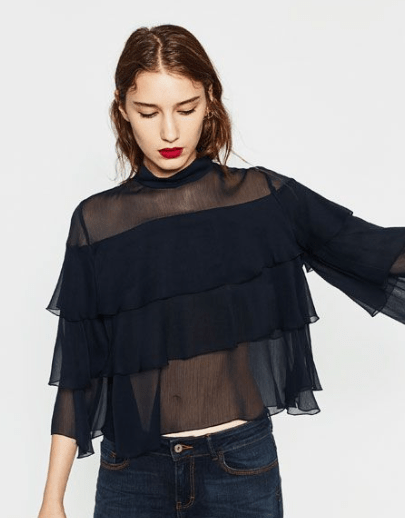 Blusa corta fluida con transparencias. Cuello subido. Volantes. Cierre en espalda.
